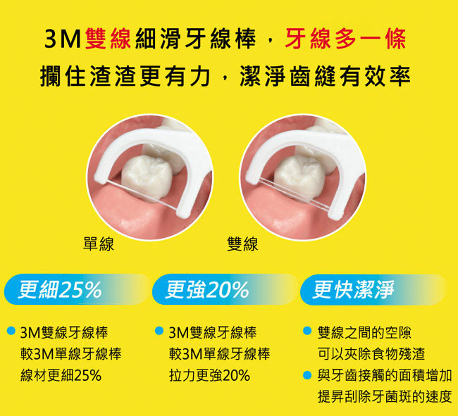 ◆雙線牙線棒使用線材,較3M單線牙線棒更細,拉力更強,清潔效率更好!