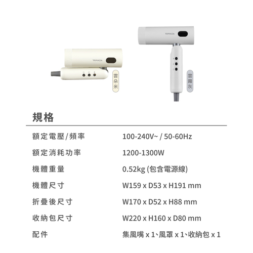 YAMADA 山田家電 國際電壓冷熱溫控高速摺疉吹風機 YBH-12QN02-M (米)