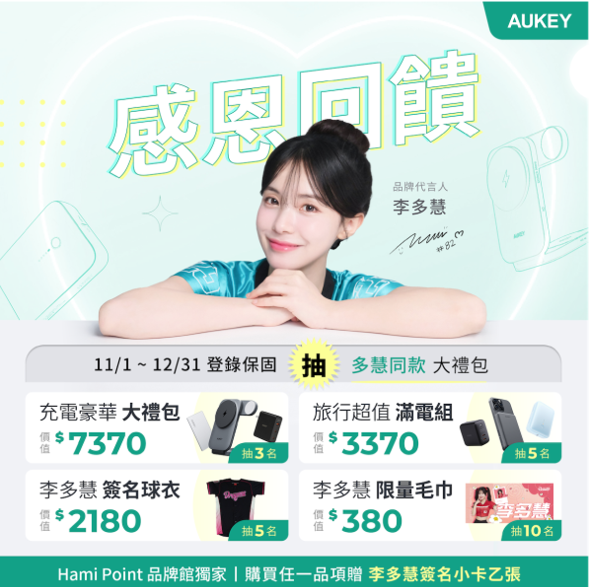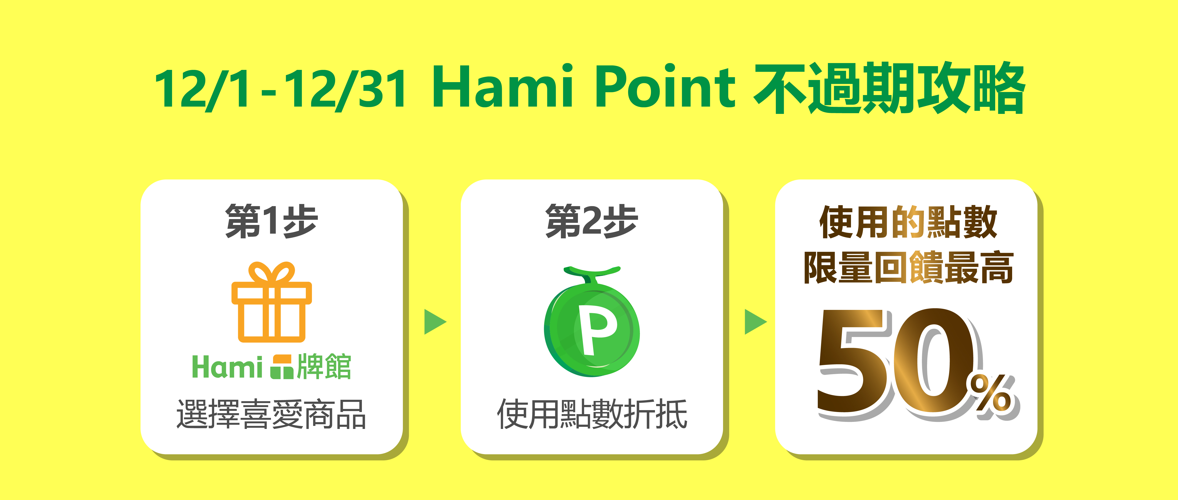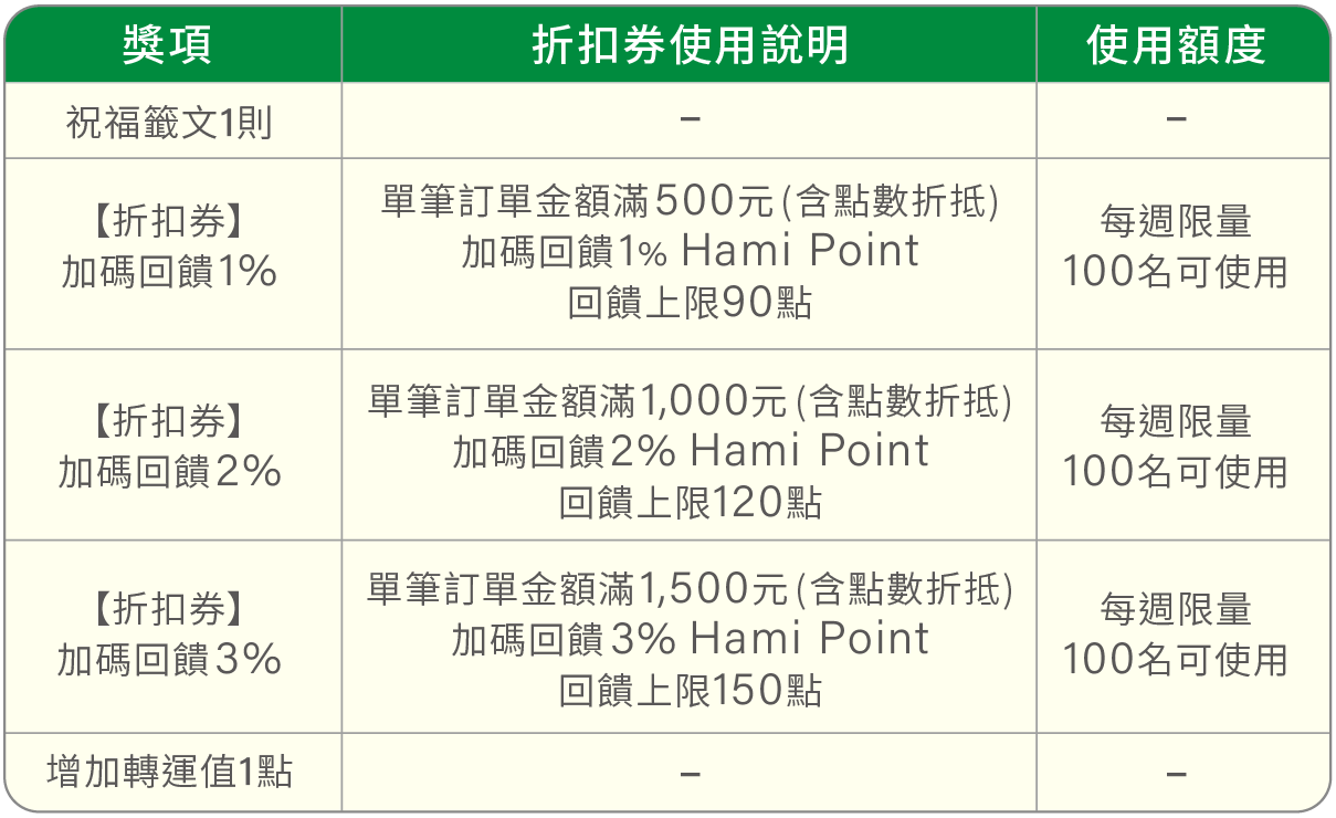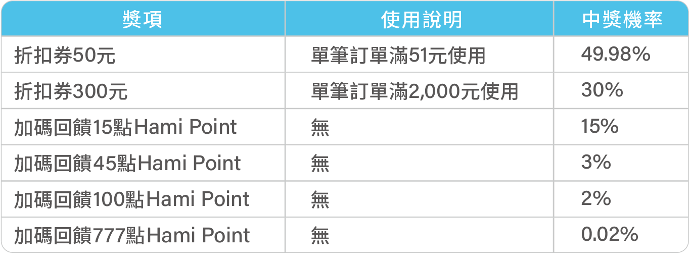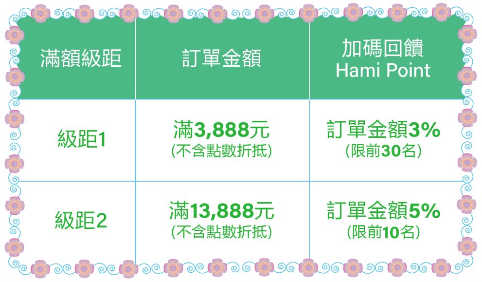 - 點數再生PLUS+:使用Hami Point抵扣訂單金額滿$2,024,回饋抵扣金額之50% Hami Point;每日限量10名(額滿停用),活動期間內限每帳戶使用1次。