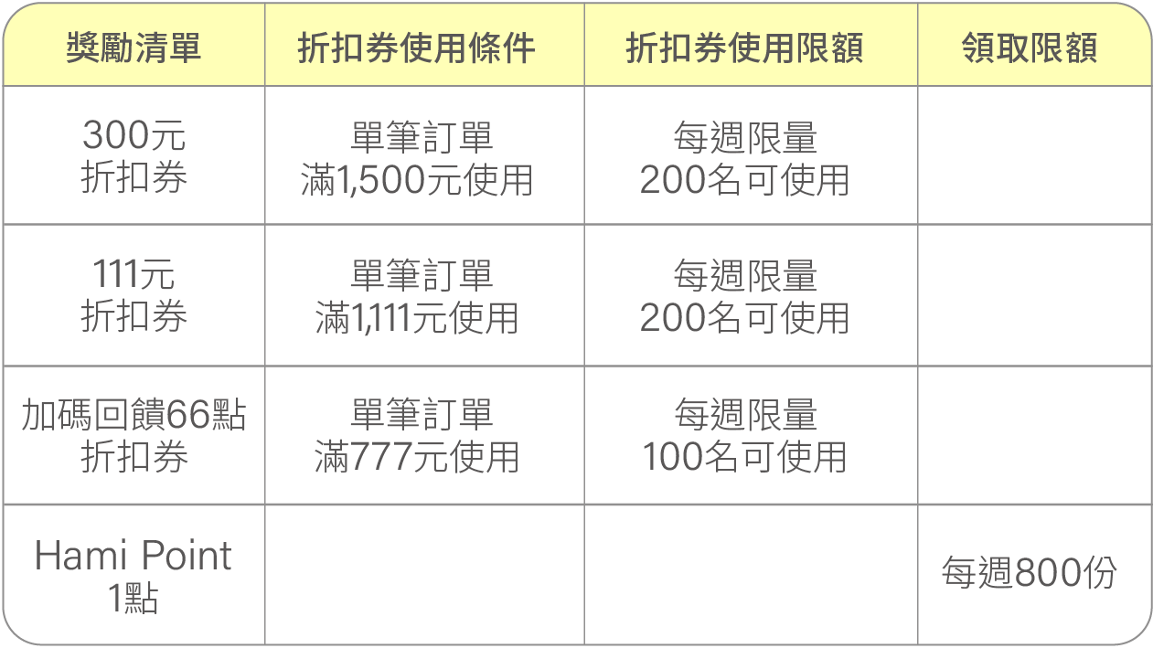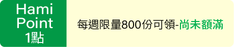 - 點數再生PLUS:使用Hami Point抵扣訂單金額滿$113,回饋抵扣金額之24% Hami Point;每日限量100名(額滿停用),活動期間內限每帳戶使用5次。