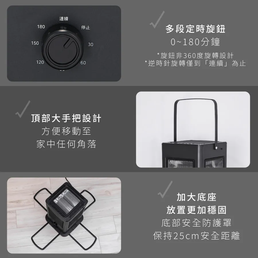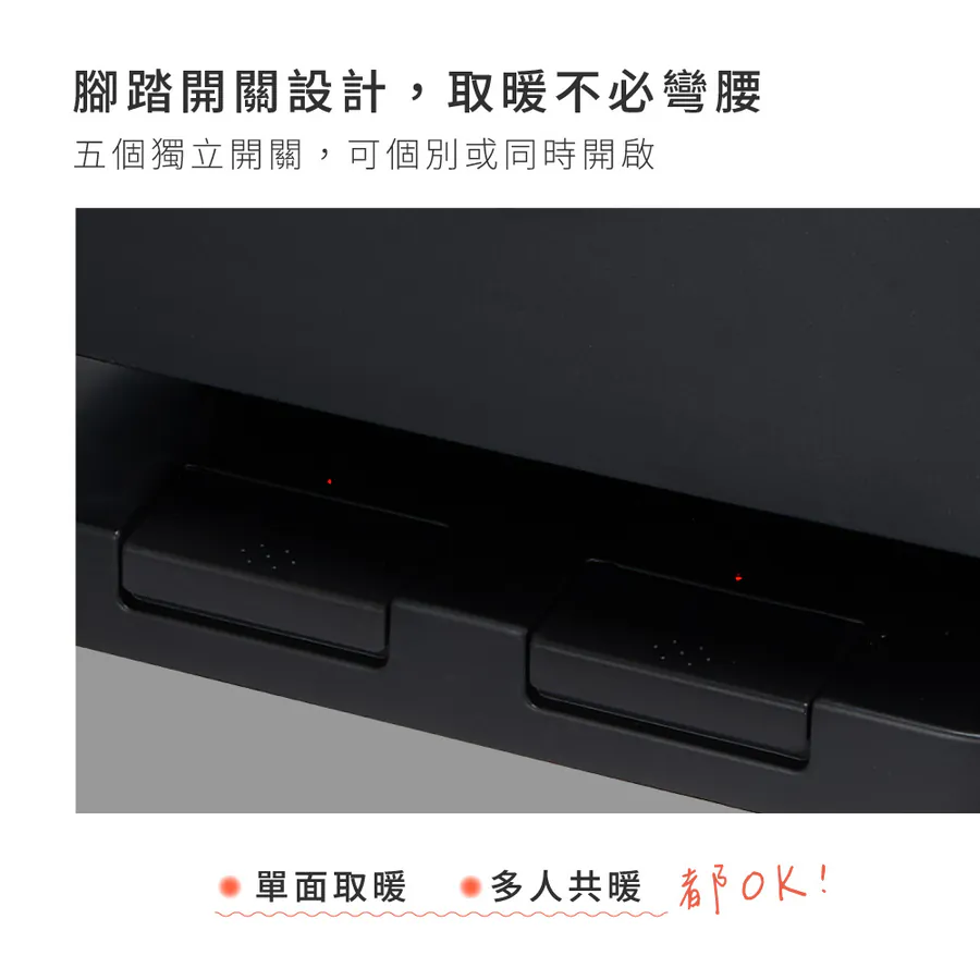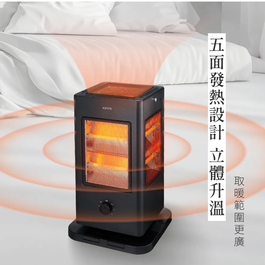 - 取暖對流快,可讓四周或多人同時溫暖