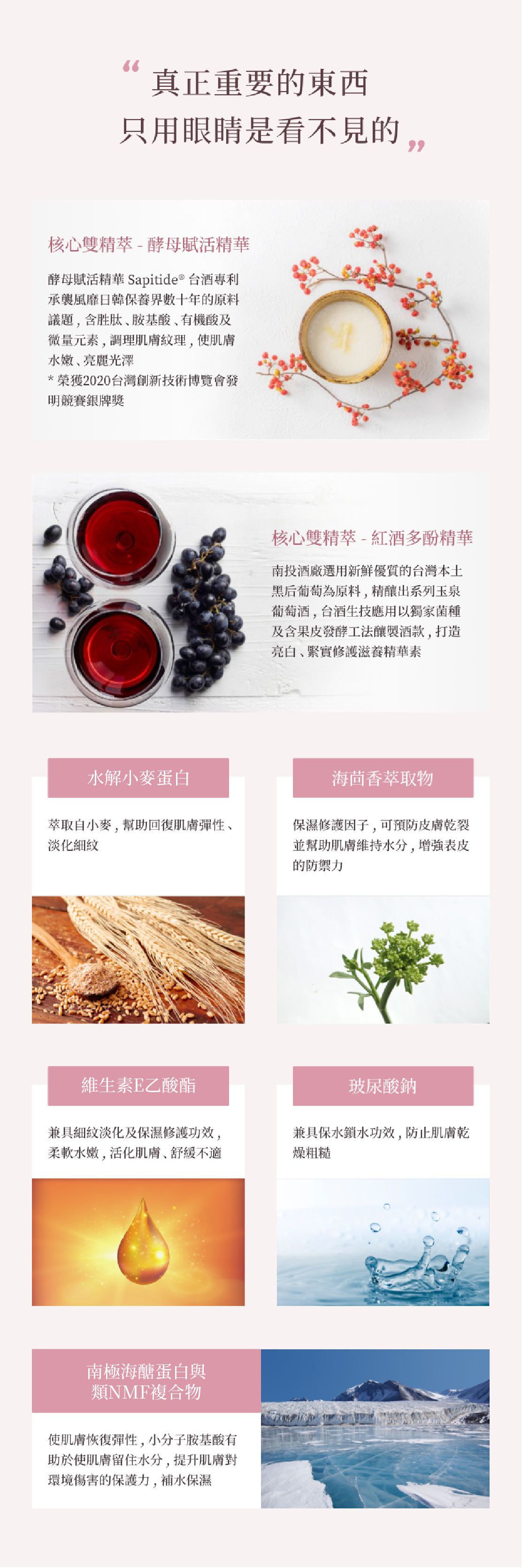 - 水解小麥蛋白萃取自小麥,幫助回復肌膚彈性、淡化細紋。
