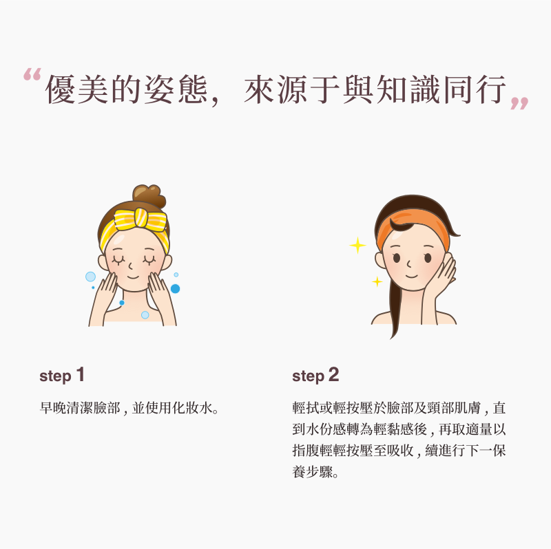 清潔臉部後,以化妝棉適量浸濕輕拍全臉至吸收,或潤濕雙手以指腹均勻輕拍全臉後,再以掌心輕輕按壓至吸收即可。
