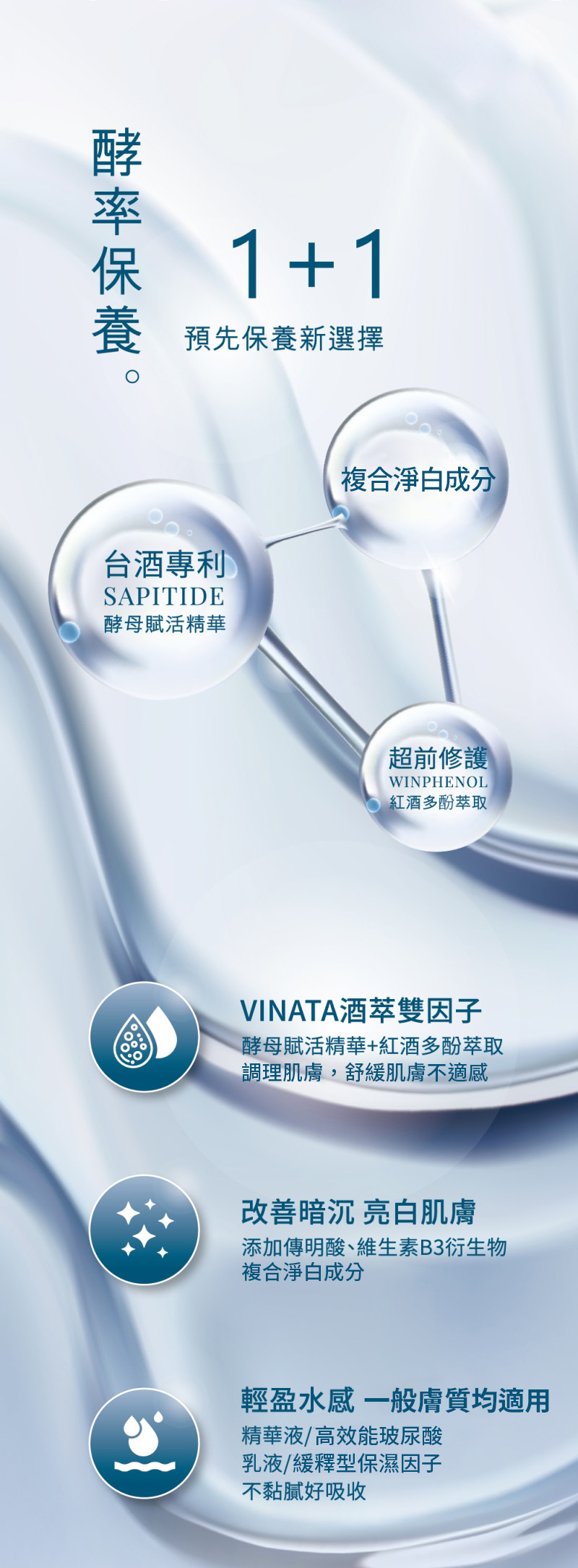 - 商品組合:酒粕精粹逆齡活膚青春露 金裝版2瓶+VINATA密集美白乳液1瓶+VINATA密集美白精華液1瓶