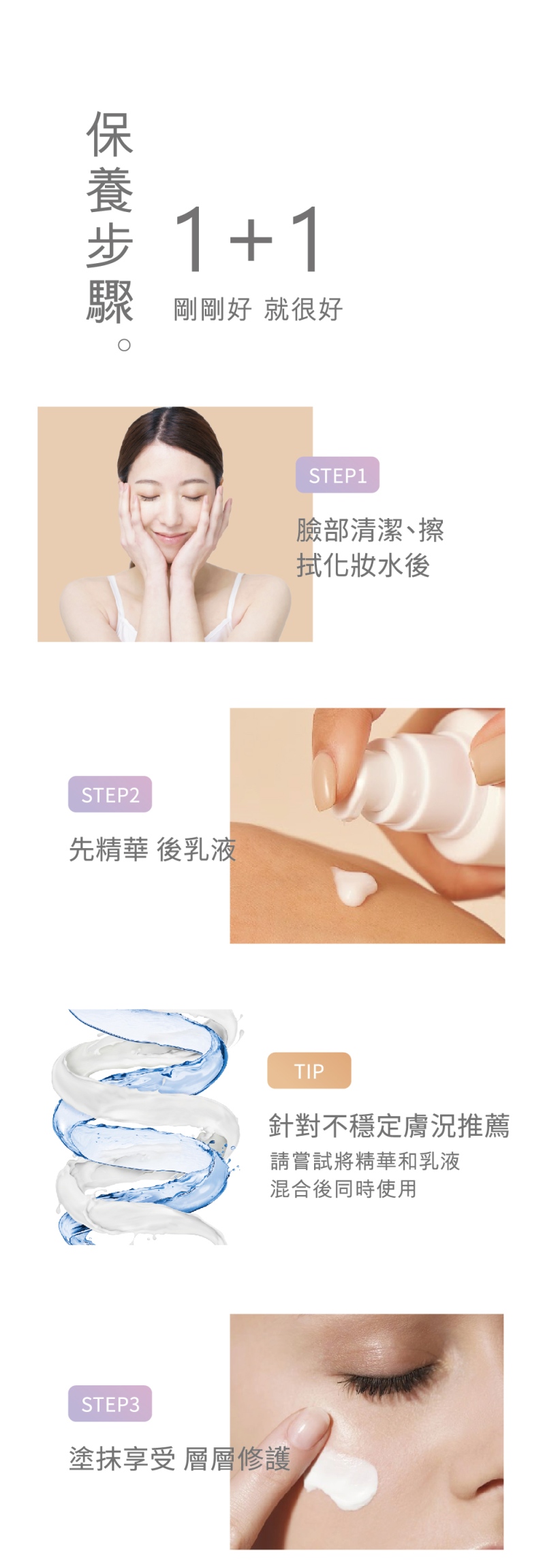 - 精華液含高效能玻尿酸,高校補水,修復乾燥肌膚,緊實細緻晶亮。